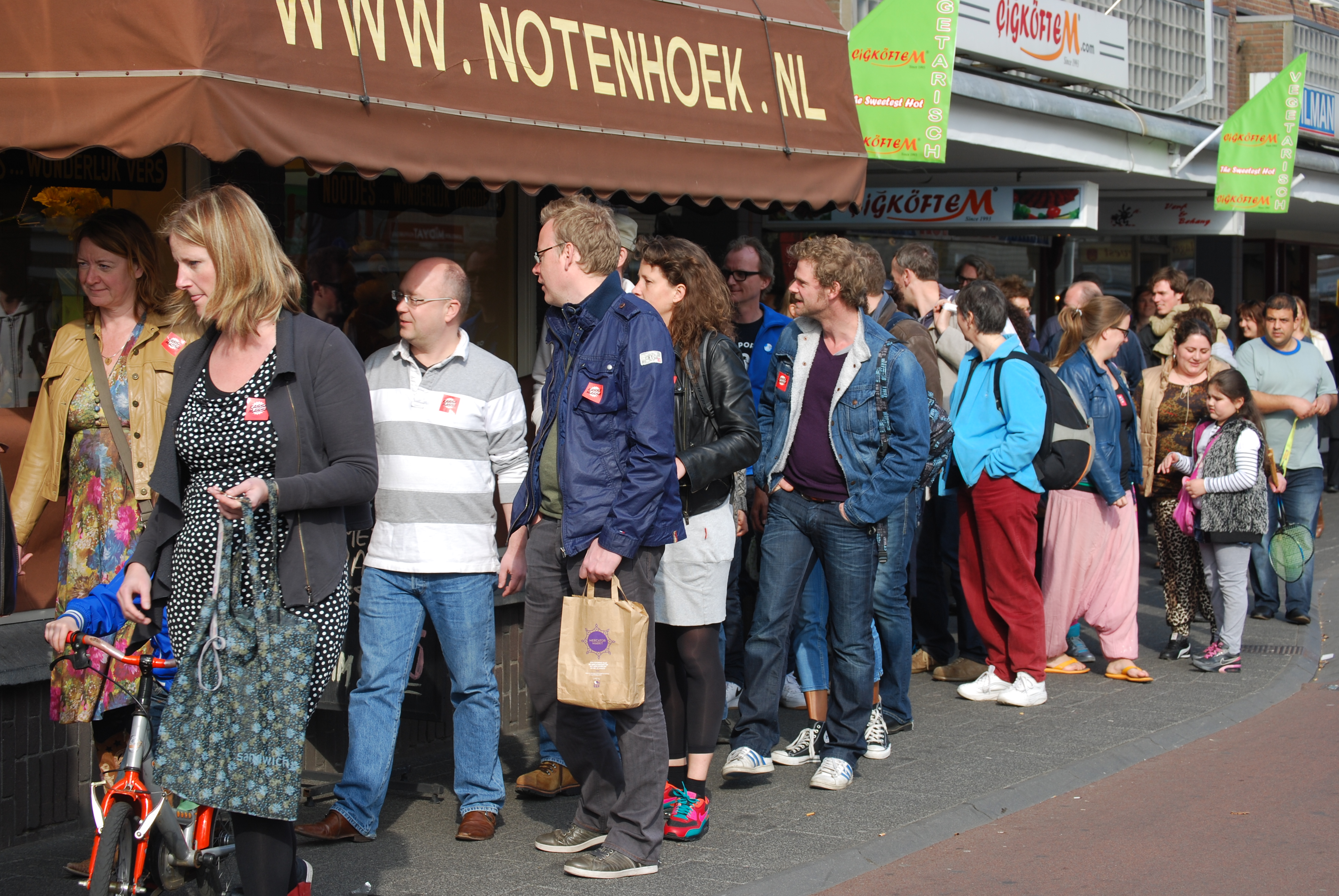 Zo’n 75 mensen, groot en klein, deden op zaterdag 24 maart 2012 mee aan de allereerste Cash Mob in Nederland! ‘Baarsjesbelievers’ Hidde, Corrie en Jeroen stonden aan de wieg van de Nederlandse variant van de Cash Mob en gaven het fenomeen de naam KassaMassa. Een KassaMassa is een grote groep mensen die met elkaar hebben afgesproken dat ze gezamenlijk op een tevoren afgesproken tijdstip voor een bepaald bedrag bij een lokale ondernemer gaan inkopen. De ondernemer wordt in overleg gekozen: het moet iemand zijn die aantoonbaar iets extra’s doet voor de omgeving, buurt of samenleving.