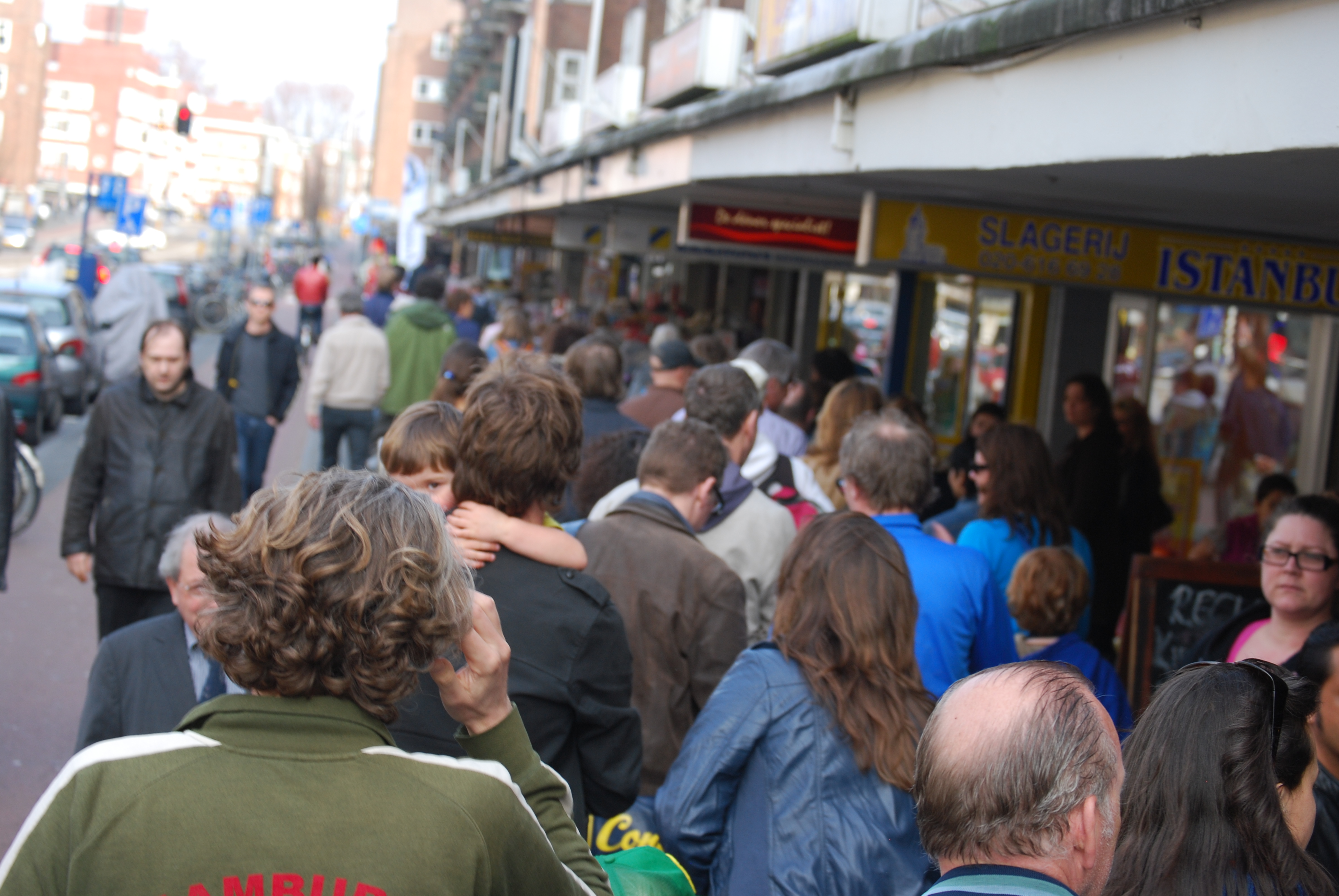 Zo’n 75 mensen, groot en klein, deden op zaterdag 24 maart 2012 mee aan de allereerste Cash Mob in Nederland! ‘Baarsjesbelievers’ Hidde, Corrie en Jeroen stonden aan de wieg van de Nederlandse variant van de Cash Mob en gaven het fenomeen de naam KassaMassa. Een KassaMassa is een grote groep mensen die met elkaar hebben afgesproken dat ze gezamenlijk op een tevoren afgesproken tijdstip voor een bepaald bedrag bij een lokale ondernemer gaan inkopen. De ondernemer wordt in overleg gekozen: het moet iemand zijn die aantoonbaar iets extra’s doet voor de omgeving, buurt of samenleving.