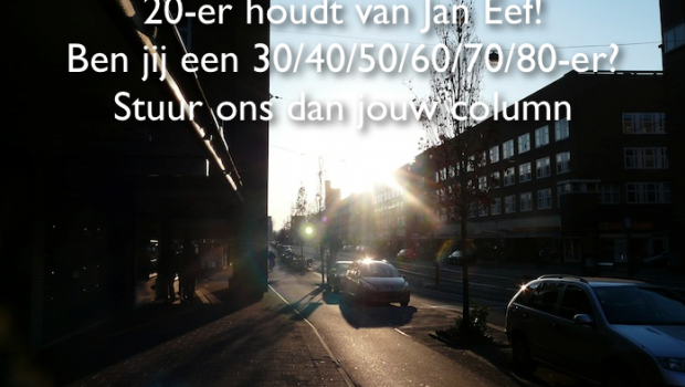 Ben jij een 30-er en geef jij om de Jan Eef, schrijf dan een column over jouw Jan Eef. Ca. 300 woorden en het liefst met een mooie foto erbij. Maar we zijn natuurlijk ook op zoek naar columnisten in de leeftijdscategorieën 40, 50, 60, 70, 80. Geinteresseerd? Meld je aan via geefomdejaneef@gmail.com