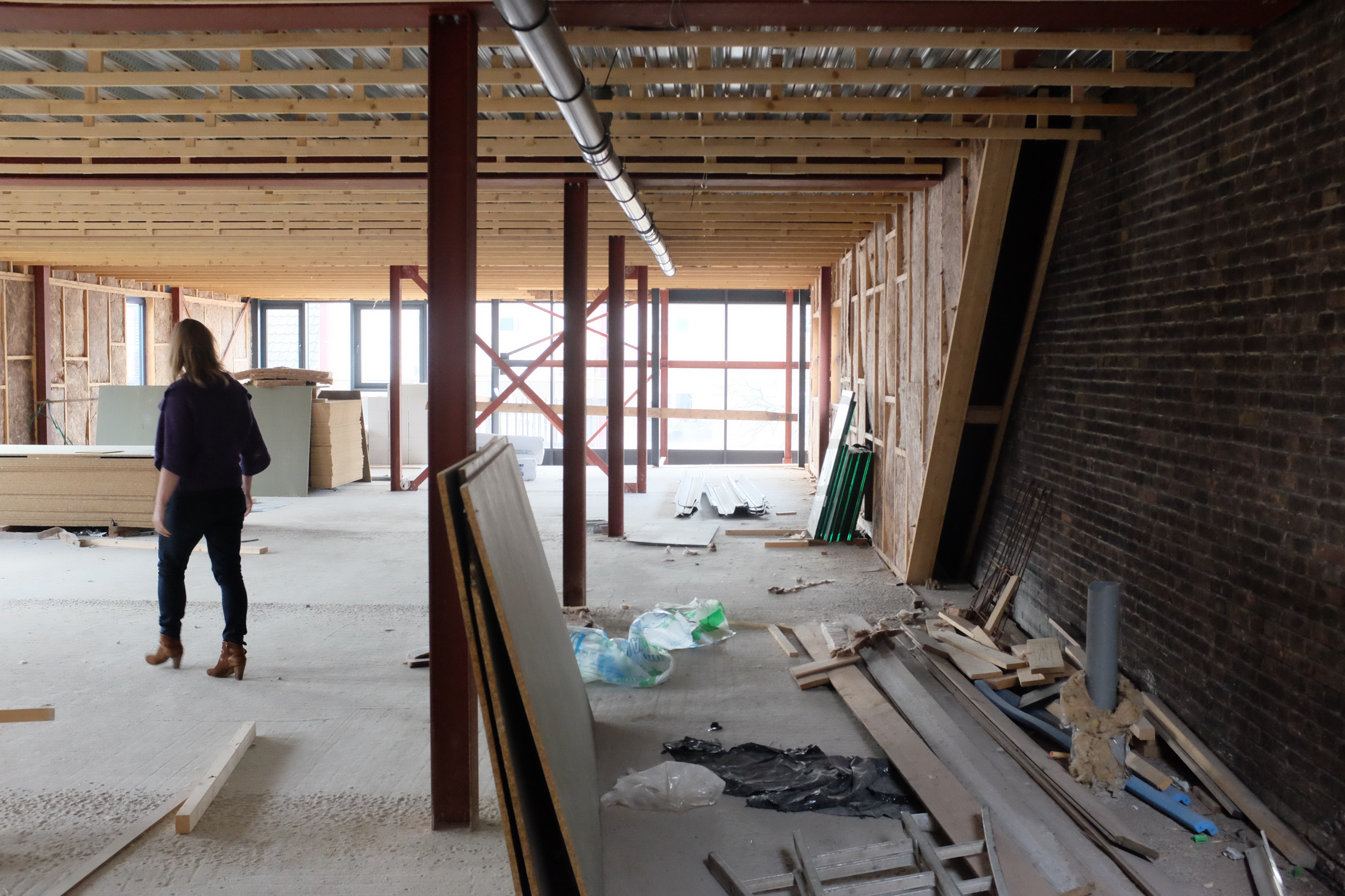 Marieke Stoffels, die de organisatie leidt, geeft een rondleiding door het gigantische gebouw. Vanuit alle hoeken en gaten klinkt nog getimmer, geklop, geboor en gezaag. In het gigantische gebouw zijn overal klussers aan de slag. De dansstudio’s zijn nu af en in gebruik, maar de rest nog niet.