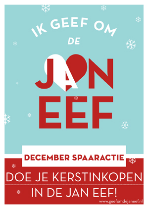 Je kerstinkopen? Die doe je natuurlijk gewoon in de Jan Eef. Zo steun je de lokale ondernemers en dat is goed voor de buurt. Vandaar dat Jan Eef deze decemberactie in het leven heeft geroepen. Met een Jan Eef stickerkaart kun je lekker winkelen en naar horeca-gelegenheden en ondertussen sparen voor korting en cadeautjes! Er zijn 35 deelnemende winkels en horeca-gelegenheden. Je kunt ze herkennen aan de actieposter.