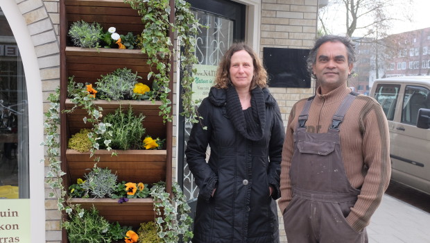 ‘Veel mensen in de stad hebben geen tuin en ze willen wel tuinieren. Dat kan best. Je kunt een verticale tuin aan de gevel maken, je kunt bij de gemeente een geveltuintje aanvragen of je kunt je balkon optimaal gebruiken. Wij adviseren mensen daarbij, en we kunnen ook het onderhoud van deze tuintjes verzorgen. We passen de vorm en de beplanting aan de wensen van de klant aan, en zorgen dat er zowel in de zomer als in de winter een mooie tuin staat of hangt. Zelfs als je een heel klein muurtje hebt, kun je met klimplanten nog de hoogte in. Je voelt, ruikt en proeft de natuur, zonder dat je ruimte inneemt van de stoep.’
