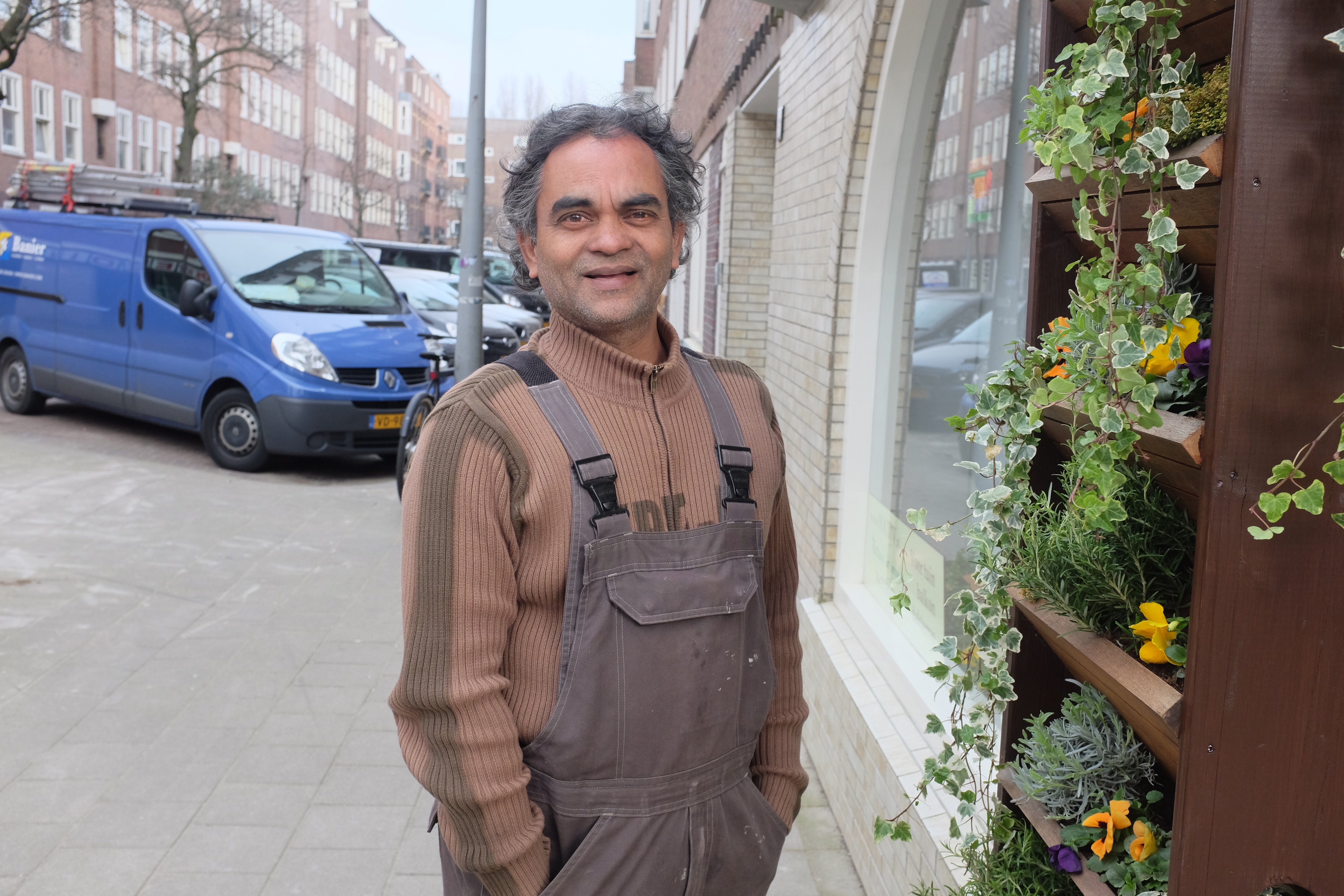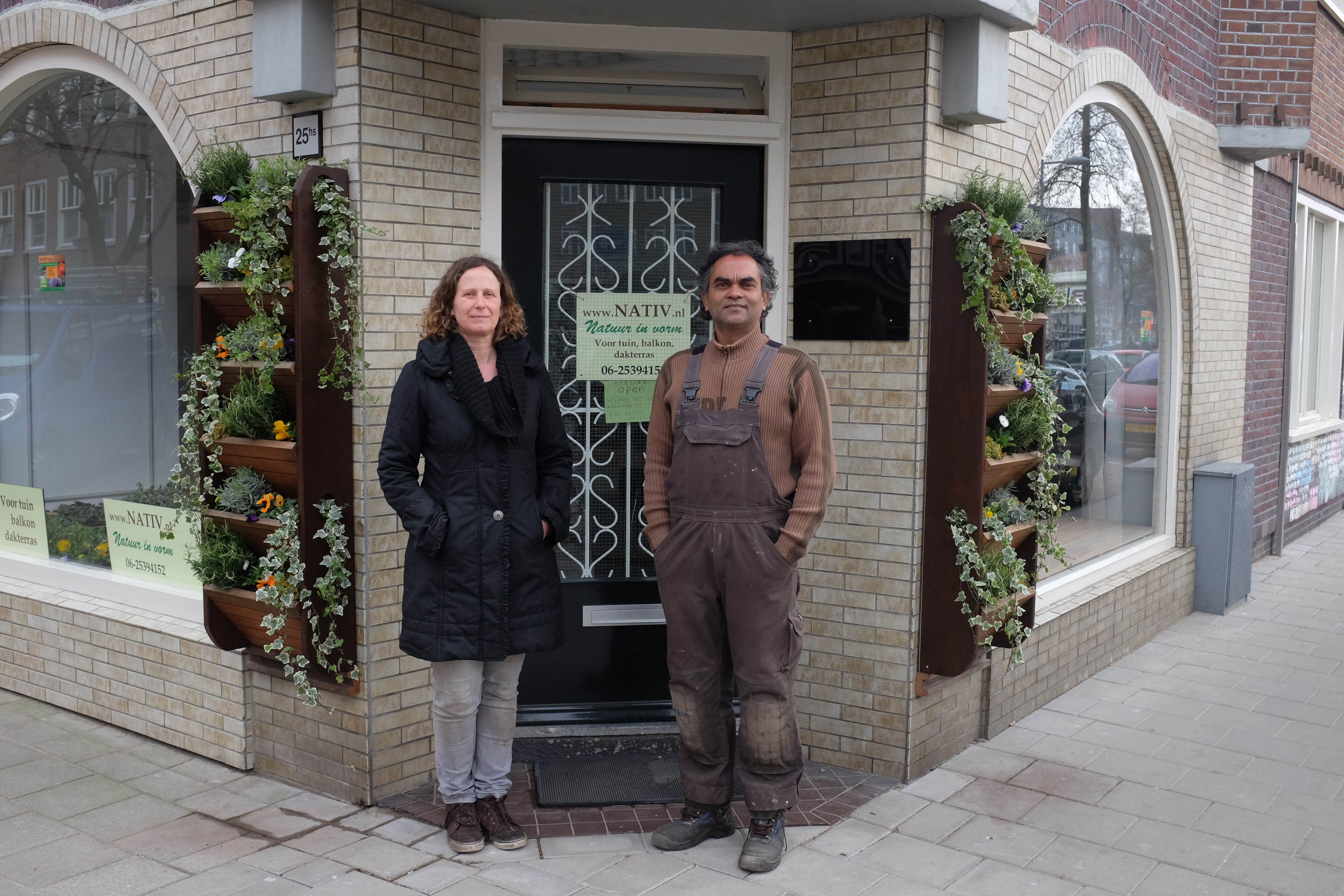 De fleurige gevel van Nativ, op de hoek van de Admiralengracht en de Jan van Riebeekstraat, valt al vanuit de verte op. Naast de voordeur: twee bloeiende voorbeelden van verticale tuintjes, ontworpen door stadshoveniers Ellen en Gilbert.