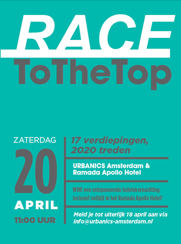 Deelname aan RACE TO THE TOP is kosteloos. Aanmelden voor het evenement kan tot uiterlijk 18 april via info@urbanics-amsterdam.nl. Kijk voor meer informatie op www.urbanics-amsterdam.nl of www.apollohotelsresorts.com/ramadaapolloamsterdam