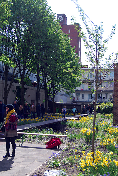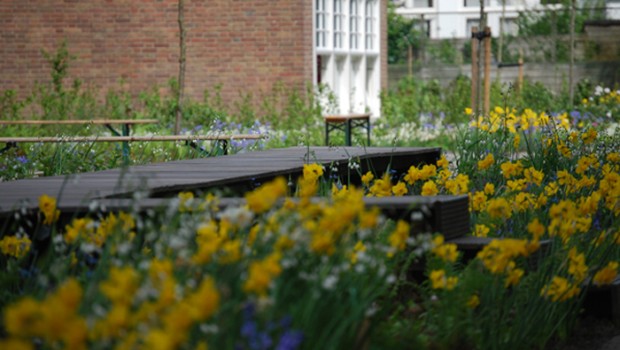 Twee jaar geleden was de binnenplaats nog een chaos van het ongezellige soort. Het voormalige speelterrein van een vroegere basisschool (nu: de Meesteropleiding Coupeur) werd niet meer gebruikt, enkel voor het permanent stallen van weesfietsen. Hekkens kreeg een idee en richtte samen met drie buurtgenoten het Jan Maijencollectief op. Nu, twee jaar later, mag het resultaat er zijn. Met het 1600 m2 grote binnenterrein is Amsterdam een paradijselijk stadstuin rijker, met een fontein, prachtige veranda’s, hemelwatervijvers en een gezellig paviljoen. Op de zonnige openingsdag stonden de gele narcissen en de blauwe krokussen volop in bloei. Ook de eerste vogels en insecten hadden hun plek al gevonden in de struiken en planten.