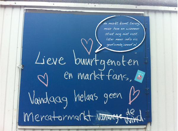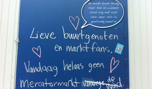 Kaas van Joke van de Kaaswinkel, biologische producten van Valentijn, worsten van La Maison du Saucisson, sap van Willem&Drees. Maar ook de Espressobus, Waffels op wielen en de Zweefmolen. Zij en vele andere kraamhouders hebben samen met een grote groep buurtbewoners het Mercatorplein het afgelopen jaar omgetoverd tot een levendig en warm hart van de Baarsjes. Met ingang van februari 2013 heeft de Winkelstraatvereniging Jan Eef besloten om de Mercatormarkt niet meer in deze vorm neer te zetten; ‘We hebben diverse vormen uitgeprobeerd. Maandelijks op de tweede zaterdag….veel mensen vonden die tweede zaterdag een moeilijk te onthouden moment. Dus schakelden we over op wekelijks, om voorspelbaar aanwezig te zijn en een vast publiek op te bouwen. Dat gaf voldoende omzet per kraam, maar de opbouw van publiek gaat traag en het buurtevenement oogde daardoor klein’. De Winkelstraatvereniging heeft al weer een nieuw plan voor de Mercatormarkt: ‘Onze conclusie is dat we voorlopig allemaal het meeste baat hebben bij zo’n vier markten per jaar. Dat worden weer van die gezellige grotere evenementen, die we natuurlijk groots gaan aankondigen. Het Mercatorplein bewonderen we de komende weken weer in alle rust vanaf het bankje. De duiven zorgen wel voor de levendigheid.